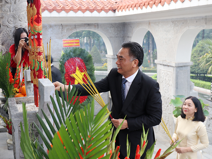Sau lễ dâng hoa, dâng hương, các đại biểu đã thắp hương tại từng phần mộ liệt sĩ đang an nghỉ tại Nghĩa trang liệt sĩ Bình Dương.