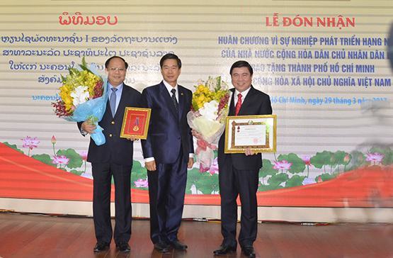 Trước đó, chiều 29-3, tại trụ sở UBND TP.HCM, thừa ủy quyền của Thủ tướng Chính phủ nước CHDCND Lào, đồng chí Sinlavong Khoutphaythoune – Ủy viên Bộ Chính trị Đảng Nhân dân Cách mạng Lào, Bí thư, Đô trưởng thủ đô Viêng Chăn (Lào) đã trao Huân chương Phát triển hạng nhất của Nhà nước CHDCND Lào tặng TP.HCM.
