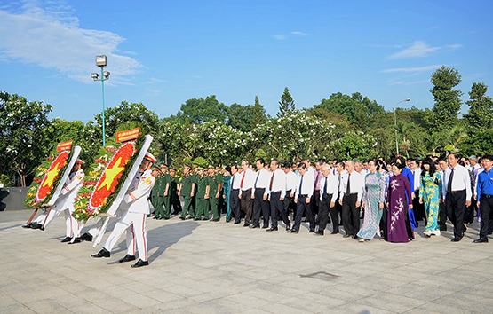 Sau lễ viếng, lãnh đạo Trung ương, TP.HCM và các đại biểu đã dâng hương, đặt vòng hoa tại tượng đài liệt sĩ và thắp hương các mộ liệt sĩ.