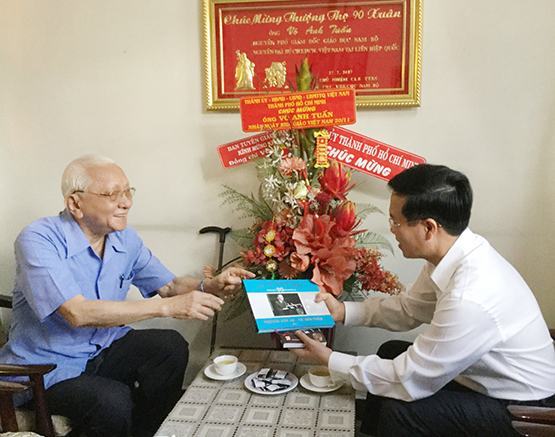 Cùng ngày, đoàn cũng đã đến thăm đồng chí Võ Anh Tuấn (92 tuổi) – lão thành cách mạng 72 năm tuổi Đảng; nguyên Phó Giám đốc Sở Giáo dục Nam Bộ, nguyên Đại sứ – Trưởng đoàn đại diện Việt Nam tại Liên hiệp quốc, Đại sứ tại Cuba, Nam Tư, Zimbabwe; Vụ trưởng, Cố vấn Bộ Ngoại giao; Ủy viên Hội đồng biên soạn sách về Mặt trận, Chính phủ cách mạng, Liên minh… Tại đây, Trưởng Ban Tuyên giáo Trung ương Võ Văn Thưởng chúc đồng chí Võ Anh Tuấn và phu nhân nhiều sức khỏe và niềm vui trong năm mới, tiếp tục đồng hành cùng sự phát triển của TP và đất nước. Đồng chí Võ Văn Thưởng khẳng định cuộc đời hoạt động cách mạng đầy trách nhiệm, cống hiến hết mình vì sự nghiệp chung của ông Võ Anh Tuấn từ những ngày tuổi trẻ trong mọi hoạt động đến lúc được nghỉ ngơi vẫn tiếp tục trăn trở về nhiều vấn đề của đất nước; Tích cực tham gia công tác đóng góp cho xã hội, là tấm gương sáng cho tất cả cán bộ, đảng viên thế hệ trẻ sau này.