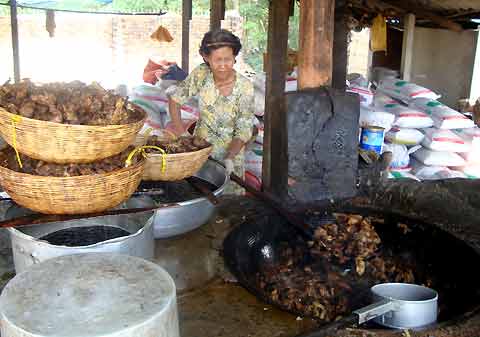 Ở khu vực chế biến, hai bếp nấu cỡ lớn được che chắn trong nhà lá xập xệ, trên nền đất ẩm, dơ. Cách nơi chế biến vài mét là khu chuồng heo cùng bãi nước thải lộ thiên đang bốc mùi hôi nồng nặc.