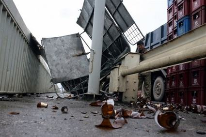 Khoảng 10h ngày 26.5, khi đang lưu thông trên cầu Thăng Long (Hà Nội), chiếc xe tải chở bia BKS: 30U- 6661 “rơi” vào một ổ gà, khiến xe mất lái chao đảo và thùng xe lật úp xuống mặt cầu Thăng Long (ảnh).