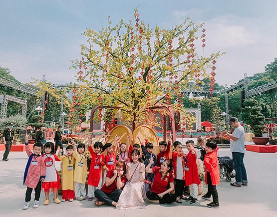 Du khách và các em thiếu nhi đang tạo dáng chụp ảnh lưu niệm bên cây mai