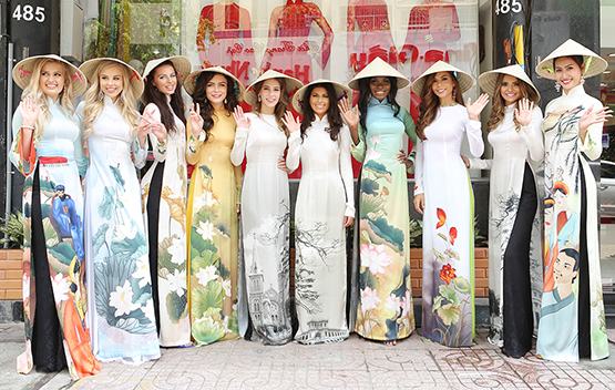 | Thí sinh cuộc thi “Hoa hậu hòa bình thế giới 2017” trong trang phục áo dài Việt Nam. Ảnh: Duy England |