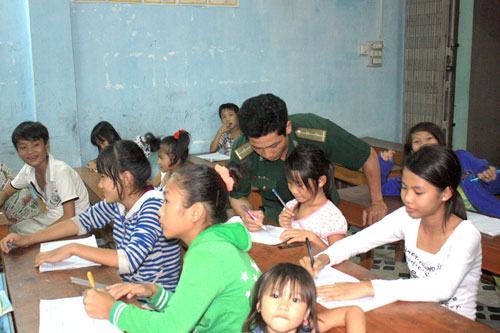 Tối thứ hai đến thứ sáu hằng tuần, trung úy Nguyễn Văn Tưởng (Đồn biên phòng 372, Bộ Chỉ huy Bộ đội biên phòng tỉnh Khánh Hòa) chạy xe hơn 7 km từ nhà đến lớp học tình thương ở P.Vĩnh Phước để dạy chữ cho các em có hoàn cảnh khó khăn. Tưởng quê Kim Bảng (Hà Nam), năm nay 37 tuổi, anh đã có “thâm niên” 14 năm làm cán bộ Đoàn các chi đoàn trực thuộc Bộ đội biên phòng tỉnh. Khoảng thời gian làm việc tại P.Vĩnh Phước, nhận thấy cuộc sống người dân còn nhiều khó khăn, nhiều em nhỏ không được đến trường, anh nảy ra ý tưởng sẽ dạy học cho các em nơi đây. Sau khi xin phép cấp trên và được sự đồng ý của chính quyền địa phương, năm 2004 lần đầu tiên Tưởng đứng lớp trong vai trò một thầy giáo. Lớp học ban đầu chỉ có 15 em, nhưng để có “sĩ số” này, Tưởng đã phải cật lực đến tận nhà từng em để khuyên bảo, vận động các em đến lớp. Tưởng nói: “Các em ở đây có hoàn cảnh rất khó khăn, cha mẹ lo làm kiếm tiền mưu sinh, các em lêu lổng nên khi nói đến việc học, nhiều em xem đó là điều quá xa lạ. Khi đến nhà vận động, có em nói “học làm gì, học có được gì đâu?”, mình phải thuyết phục mãi các em mới đến lớp”.