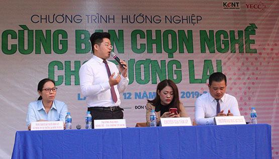 Ban tư vấn chương trình hướng nghiệp “Cùng bạn chọn nghề cho tương lai” trả lời các câu hỏi của học sinh Trường THPT Tạ Quang Bửu