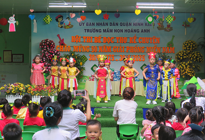 Chào mừng 50 năm Ngày Thống nhất đất nước (30-4-1975/ 30-4-2025), Trường MN Hoàng Anh tổ chức hội thi “Bé đọc thơ – kể chuyện” với chủ đề “Những câu chuyện, tiết mục văn nghệ về quê hương, đất nước”. Tất cả khối lớp đều tham gia hội thi: Từ các cháu 13 tháng lẫm chẫm múa hát bên cạnh cô giáo, đến các tiết mục kể chuyện và trình diễn đặc sắc của các cháu khối mẫu giáo.