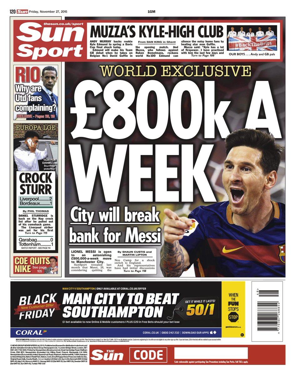 Tờ The Sun số ra ngày hôm nay khẳng định chỉ có Man City chấp nhận cuộc chơi thế kỷ này. Theo đó, họ đang đàm phán với người đại diện của Messi và sẵn sàng trả mức lương lên tới 800.000 bảng/tuần (1,1 triệu euro/tuần) để lôi kéo siêu sao người Argentina.