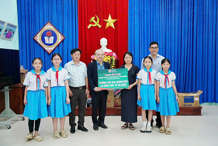Theo đó, đoàn đã trực tiếp trao các suất quà gồm vở bút, dụng cụ học tập và nhu yếu phẩm, đây là phần đóng góp từ nhiều tấm lòng hảo tâm tại điểm tiếp nhận Đại học Đông Á đến toàn bộ học sinh tại 3 điểm trường tiểu học tại xã Nông Sơn (Quảng Nam cũ, nay là TP.Đà Nẵng). Với tổng 1.301 học sinh tại 3 trường TH Phạm Phú Thứ, TH Hoàng Diệu và TH Nguyễn Đình Hiến, đoàn đã trao 14.159 cuốn vở, 2.435 bút chì, 2.000 bút bi, 1.423 bút mực cùng các văn phòng phẩm và đồ dùng khác đến đại diện nhà trường. Đồng thời, 5 suất hỗ trợ gồm tiền mặt và nhu yếu phẩm cũng được trao đến 5 gia đình khó khăn, bị thiệt hại nặng trong đợt lũ lụt lịch sử cuối tháng 10 vừa qua tại xã Nông Sơn.