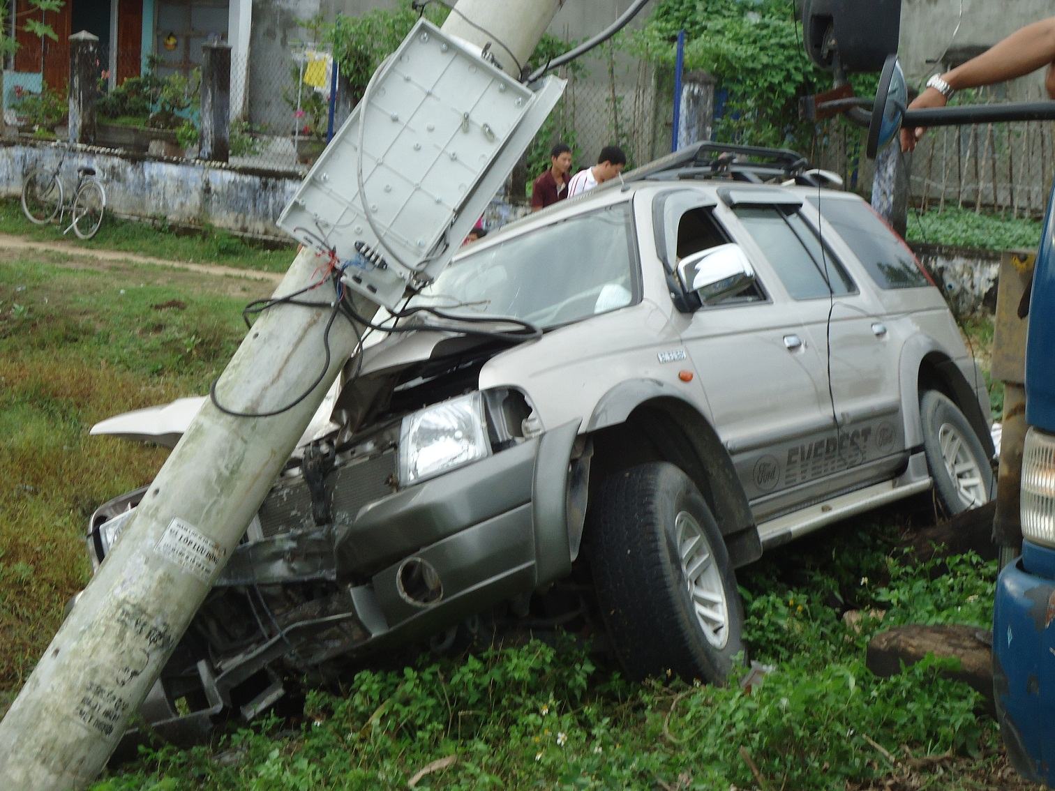 Đang lưu thông trên quốc lộ, chiếc xe Ford Everest bất ngờ lao sang bên phải đường đâm đổ trụ điện gây mất điện nhiều giờ.
