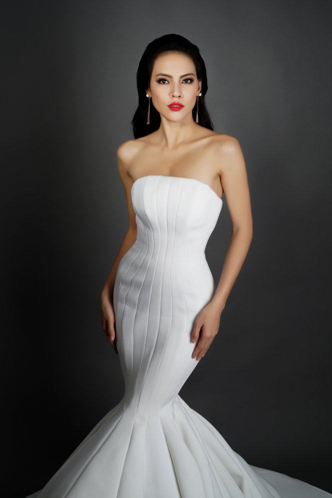 Chiếc đầm đuôi cá màu trắng mà Lệ Quyên mặc để trình diễn là do nhà thiết kế Hoàng Minh Hà thực hiện.