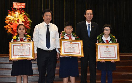Giám đốc Sở GD-ĐT TP.HCM Lê Hồng Sơn tặng Bằng khen của UBND TP.HCM cho HS giỏi tiêu biểu