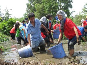 “Bên này. Cá ở bên này nè! Mau qua đây mấy bạn ơi!”. Tiếng các bạn trẻ í ới gọi nhau, quần áo, mặt mũi ai cũng đều lấm lem bùn đất khi lần đầu tiên được bắt cá. Có bạn mới bắt được cá, lóng ngóng thế nào lại tuột mất. Tiếc “của”, những chiến sĩ xung quanh lại được dịp “hôi” lại. Đây có lẽ là cảnh nhộn nhịp, đáng yêu nhất của ngày hội “Một ngày làm nông dân” do Quận đoàn Q.12 và Hội Nông dân TP.HCM tổ chức. Những tưởng công việc này sẽ bị nhiều bạn “chê” vì sợ cảnh bùn đất lấm lem quần áo, nhưng khi ban tổ chức vừa hô hiệu lệnh thì đông đảo “thí sinh” đã nhảy ngay xuống mương để cho… bằng anh bằng chị. Đội nào cũng lùng sục khắp ngóc ngách để tìm cho đủ số lượng cá ban tổ chức đưa ra. Do đó, cảnh lấm lem bùn đất lại là khoảnh khắc vui nhộn, đáng nhớ nhất của mùa hè.