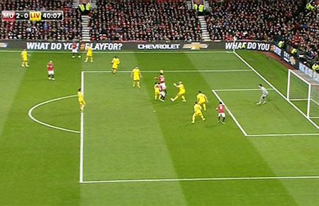 Phút 40, Mata khởi tạo đợt tấn công ra bên trái, bóng đến chân Young, cầu thủ này loại bỏ một hậu vệ của Liverpool sau đó tạt vào trong nhắm đến vị trí của Van Persie. Tiền đạo người Hà Lan đánh đầu sượt bóng, vô tình bóng rơi về phía Mata ở gần cột dọc phải và tiền vệ người Tây Ban Nha dễ dàng đưa bóng vào lưới trống nhân đôi cách biệt. Thực ra Mata đã việt vị trong tình huống này nhưng trọng tài không quan sát thấy.