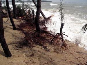 Sóng biển triều cường cuốn trôi bờ biển thôn Phổ Trường, xã Nghĩa An, huyện Tư Nghĩa. (Ảnh: Thanh Long/TTXVN)