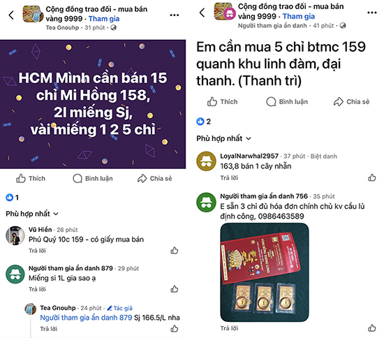 Cũng tầm thời gian này, một thành viên có tên Tea Gnouhp thông báo: “HCM – Mình cần bán 15 chỉ Mi Hồng giá 15,8 triệu đồng/chỉ; 2 lượng miếng SJC, vài miếng 1,2,5 chỉ”. Khi có khách với nick Người tham gia ẩn danh 879 hỏi: “Miếng SJC 1 lượng giá bao nhiêu?” thì Tea Gnouhp trả lời: “165,5 triệu đồng/lượng”. Một thành viên khác là Người tham gia ẩn danh 927 hỏi: “163 bán không”, Tea Gnouhp trả lời: “Không bán”.