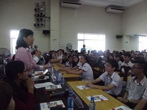 (GD TP.HCM): – Ngày 1-11, chương trình hướng nghiệp “Đúng ngành nghề – sáng tương lai” năm 2014 do Báo Giáo dục TP.HCM tổ chức đã đến với 3 trường THPT là THPT Vĩnh Viễn, Nguyễn Hữu Thọ và Bà Điểm. Học sinh đã được các chuyên gia tư vấn tuyển sinh chia sẻ kinh nghiệm chọn nghề, giải đáp những băn khoăn về một kỳ thi THPT quốc gia, về các ngành nghề như quản lý nhà hàng khách sạn, tài chính ngân hàng, công nghệ thông tin… TS. Lê Thị Thanh Mai – Trưởng ban Công tác sinh viên ĐHQG TP.HCM cho biết: “Thông thường, sau khi tốt nghiệp THPT, học sinh sẽ thi ĐH theo phương thức 3 chung (kỳ tuyển sinh năm 2014 có một số trường ĐH tuyển sinh riêng) nhưng năm 2015 học sinh lớp 12 sẽ không trải qua hai kỳ thi mà chỉ thực hiện một kỳ thi THPT quốc gia, trong đó tốt nghiệp THPT sẽ thi 4 môn (3 môn bắt buộc và 1 môn tự chọn). Kỳ tuyển sinh trước, thí sinh thường chọn trường thi ĐH, CĐ dựa vào điểm chuẩn những năm trước của trường đó, danh tiếng của trường nhưng năm nay nếu làm theo cách này các em sẽ khó vào được trường ĐH phù hợp với sở thích của mình. Vì vậy, dù năm nay cơ hội vào ĐH của các em rộng mở hơn nhưng các em phải định hướng sớm, tìm hiểu kỹ yêu cầu các ngành nghề, các trường đào tạo…”.