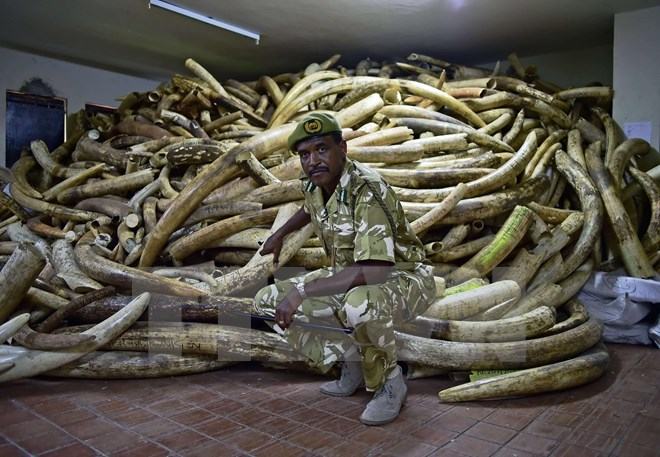 Cảnh sát Kenya gác bên số ngà voi thu giữ trong chiến dịch chống buôn lậu các sản phẩm động vật hoang dã quý hiếm tại Nairobi. (Nguồn: AFP/TTXVN)
