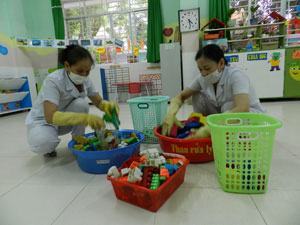 Các cô Trường Mẫu giáo Sơn Ca 3, Q.11 kiểm tra, vệ sinh đồ chơi để chuẩn bị đón trẻ vào năm học mới |