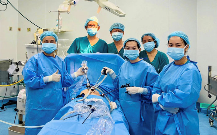 Bệnh nhân được chuyển vào phòng mổ với đầy đủ phương tiện phẫu thuật nội soi và hệ thống gây mê – hồi sức. Ca phẫu thuật bắt đầu lúc 8 giờ và kéo dài hơn một giờ. Các bác sĩ đã loại bỏ khối thai ngoài tử cung bị vỡ, cầm máu và làm sạch ổ bụng, bảo đảm an toàn cho người bệnh.