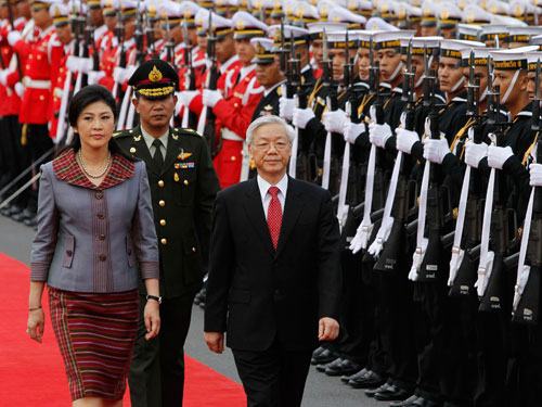 Thủ tướng Thái Lan Yingluck Shinawatra và Tổng Bí thư Nguyễn Phú Trọng tại lễ đón. Ảnh: REUTERS