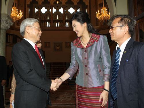 Sáng 25-6, Tổng Bí thư Nguyễn Phú Trọng và đoàn đại biểu cấp cao Việt Nam đã tới thủ đô Bangkok, bắt đầu chuyến thăm chính thức Vương quốc Thái Lan theo lời mời của Thủ tướng Chính phủ Hoàng gia Thái Lan Yingluck Shinawatra. Chiều cùng ngày, ngay sau lễ đón chính thức, Tổng Bí thư Nguyễn Phú Trọng đã hội đàm với Thủ tướng Yingluck Shinawatra. Tại cuộc hội đàm, hai nhà lãnh đạo đã tập trung trao đổi về các phương hướng, biện pháp lớn nhằm tăng cường quan hệ hợp tác giữa hai nước trong thời gian tới; trao đổi về những vấn đề quốc tế và khu vực cùng quan tâm.