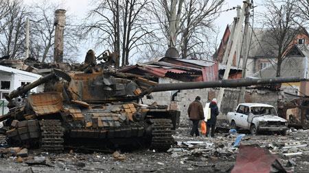 Xe tăng bị phá hủy của lực lượng vũ trang Ukraina ở Volnovakha, Donetsk.