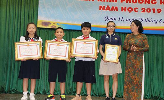 Bà Bùi Thị Diễm Thu – Phó Giám đốc Sở GD-ĐT TP – trao giấy khen cho HS Q.11 đạt giải thưởng quốc tế. Ảnh: L.Đỗ
