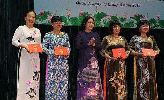 Bà Bùi Thị Diễm Thu – Phó Giám đốc Sở GD-ĐT TP – chúc mừng 2 đơn vị GD Q.4 được nhận Huân chương Lao động hạng nhì, hạng ba. Ảnh: L.Đỗ
