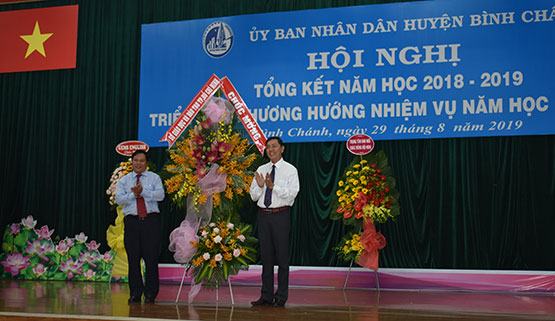 Ông Nguyễn Huỳnh Long – Trưởng phòng Tổ chức Cán bộ, Sở GD-ĐT (bìa trái) tặng hoa chúc mừng ngành GD-ĐT huyện Bình Chánh. Ảnh: Tr.Nguyễn