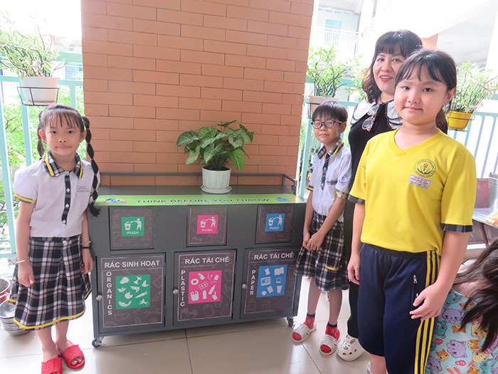 Như nhiều trường học khác, trước đây trường bố trí thùng đựng riêng cho rác sinh hoạt và rác tái chế. HS các lớp bỏ rác vào bọc nilon đặt trước lớp, cuối giờ nhân viên cấp dưỡng mang các bao rác xuống các thùng đựng rác dưới sân trường. Cô Huỳnh Thị Xuân Lan – Hiệu trưởng trường, thẳng thắn cho biết: “Cách làm này chưa thật sự hiệu quả. Tôi cố gắng để những bài học về bảo vệ môi trường cho các em không chỉ là lý thuyết, mà phải trở thành hoạt động nhằm đảm bảo vệ sinh môi trường, hòa nhập quốc tế”.