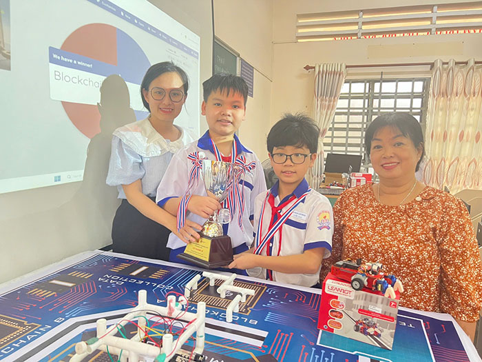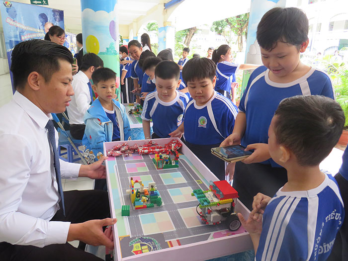 Thầy Nguyễn Minh Triết – Hiệu trưởng trường, chia sẻ: “HS được làm quen với tin học từ năm lớp 1, được giảng dạy ngôn ngữ lập trình từ sớm, vì thế các em yêu thích các ngôn ngữ lập trình Sracth và lập trình Blockly cùng Robot Leanbot… góp phần hình thành nhân cách cho HS từ các chủ đề thực tiễn mang tính nhân văn như: Bảo vệ môi trường, tiết kiệm năng lượng hiệu quả, giảm hiệu ứng nhà kính… Đặc biệt là việc học và sử dụng tiếng Anh của các em được cải thiện đáng kể”.