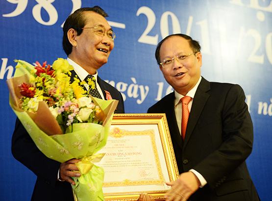 Phó bí thư Thường trực Thành ủy Tất Thành Cang trao Huân chương Lao động hạng Ba cho ông Nguyễn Hữu Hùng – Chủ tịch Công đoàn GD TP
