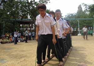 Một trong những điểm nhấn góp phần tạo nên sự rộn ràng cho ngày hội chính là những trò chơi liên hoàn được tổ chức cho HS các trường tham gia. Mang chủ đề “Cùng giao thông an toàn”, các trò chơi đều được thiết kế gắn liền với các hoạt động giao thông như đi xe đạp, treo biển báo hiệu đúng vị trí… Với trò chơi mang tên gọi “Em hiểu Luật Giao thông”, các HS không chỉ phải treo đúng tên bảng báo hiệu mà còn phải mang guốc gỗ dài (10 người/lượt) để di chuyển trên đoạn đường dài 15m để đến đích. “Đã có không ít bạn dở khóc, dở cười ngã nhào lên nhau vì lúc mình bước thì chẳng bạn nào bước cùng. Để tham gia được trò chơi này cần phải có sự đoàn kết và đồng thuận của tất cả những người tham gia bởi khi tất cả cùng nhấc chân lên thì guốc gỗ mới di chuyển và nhanh về đích. Còn nếu như bạn nào chỉ chăm chăm bước một mình thì chẳng những guốc gỗ không dịch chuyển mà còn gây khó khăn cho những bạn còn lại trong đội”, Uyên Thy (HS lớp 11B3 Trường THPT Gò Vấp) phân tích. Đúng như lời Uyên Thy nói, đội chơi nào biết “chiến thuật”, sử dụng sức mạnh đoàn kết thì sẽ sớm về đích, giành chiến thắng trong sự cổ vũ nhiệt tình của các cổ động viên.