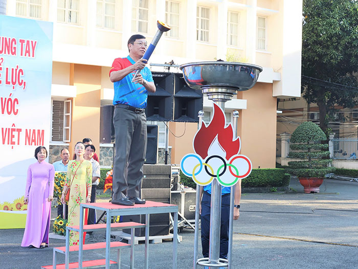 Trong nghi thức thắp đuốc khai mạc, ông Vũ Ngọc Tuất – Bí thư Đảng ủy, Chủ tịch HĐND phường Bình Thạnh đại diện các địa phương thực hiện nghi thức trang trọng, mở màn cho chuỗi hoạt động thi đấu trong hơn một tháng tới.