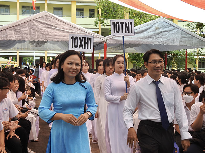 Em Nguyễn Hoàng Bảo Ngọc, học sinh lớp 10 xã hội 2, chia sẻ: “Lần đầu tiên dự khai giảng ở ngôi trường mới, em vừa hồi hộp vừa vui. Được các anh chị lớp trên chào đón nồng nhiệt làm em thấy ấm áp hơn. Em hy vọng ba năm tới ở Trung Phú sẽ là quãng thời gian đáng nhớ”.