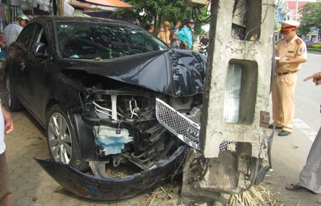Tại hiện trường, chiếc ô tô nằm xệch lên vỉa hè, đầu xe nát bươm vẫn đang “dính” vào gốc cột điện. Cú đâm cực mạnh làm cột điện gãy gốc và chực đổ xuống.