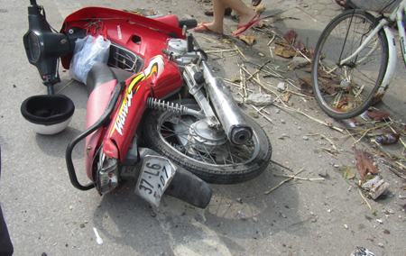 Chiếc xe máy chạy phía sau bị vạ lây làm 2 người bị thương nặng phải đi cấp cứu.