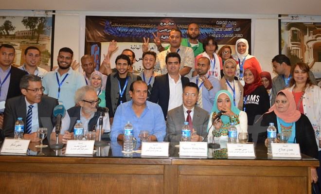 Ban tổ chức và các nghệ sỹ của Nhà hát Múa rối Cairo tại cuộc họp báo. (Ảnh: Nguyễn Trường/Vietnam+)
