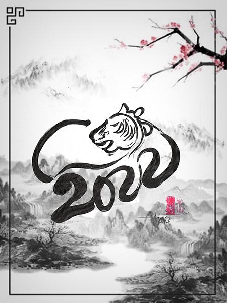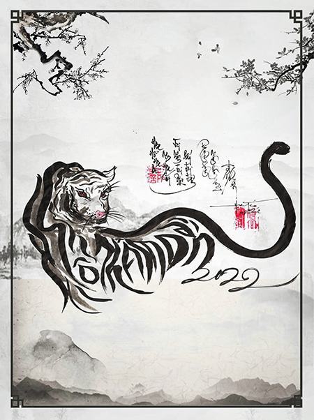 – Hổ chào xuân mới: Tác giả đã khéo léo kết hợp chữ “Nhâm Dần – hổ và số 2022”, tạo thành hình chú hổ trẻ trung, năng động đang vui mừng, chào đón mùa xuân sang. Tất cả được vẽ trên phong nền sơn thủy hữu tình và cành đào đỏ thắm, thể hiện sự vui tươi và may mắn trong năm mới.