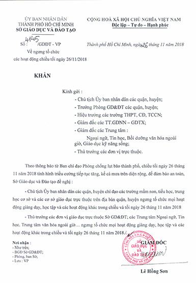 Công văn ghi rõ, theo thông báo từ Ban chỉ đạo Phòng chống lụt bão Thành phố, chiếu tối ngày 26-11 tình hình chiều cường tiếp tục tăng lên, kể cả mưa trên diện rộng, Sở GD-ĐT TP yêu cầu chủ tịch UBND các quận, huyện chỉ đạo các trường học, cơ sở giáo dục trực thuộc địa bàn; Các đơn vị giáo dục trực thuộc Sở GD-ĐT, các trung tâm ngoại ngữ, tin học, văn hóa ngoài giờ… ngưng tổ chức mọi hoạt động giảng dạy, học tập và các hoạt động khác trong chiều, tối ngày 26-11.