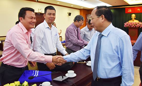 | Phó Bí thư Thường trực Thành ủy TP.HCM Tất Thành Cang thăm hỏi các đại biểu. Ảnh: Q.Huy |