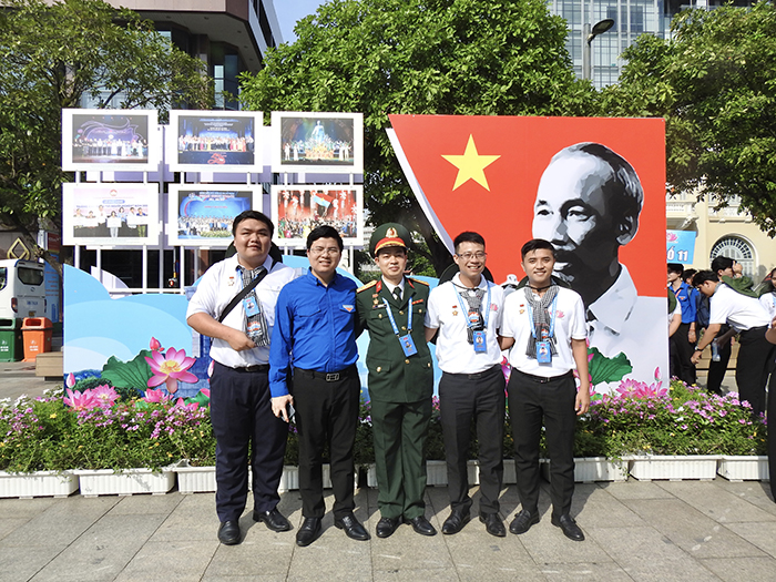 Đại biểu thanh niên chụp ảnh lưu niệm trước hình ảnh Bác Hồ trên nền cờ Tổ quốc, thể hiện sự gắn bó giữa thế hệ hôm nay với lý tưởng Người để lại