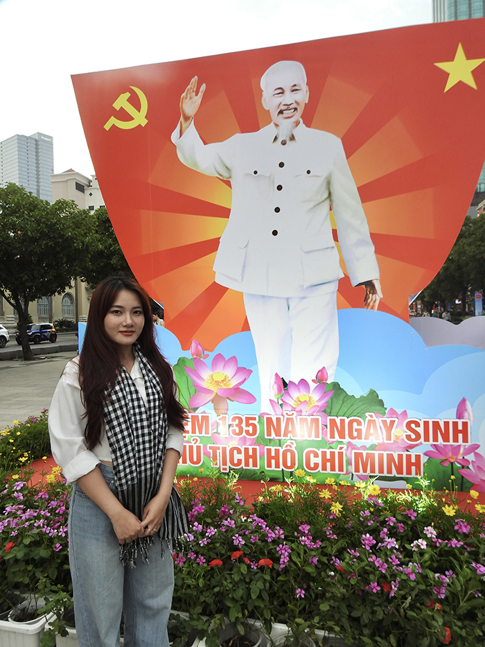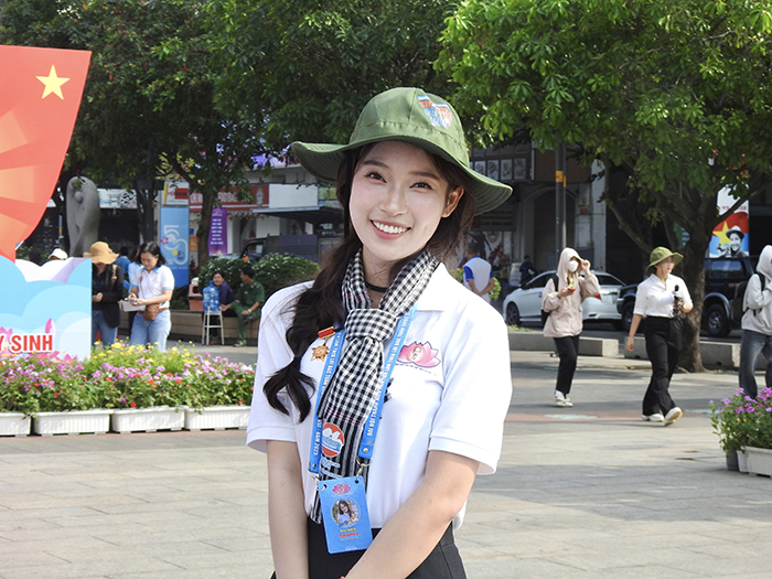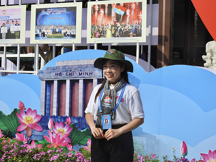 MC Trần Khánh Vy với nụ cười tươi và ánh mắt xúc động trong không gian ngập tràn hình ảnh về Bác Hồ