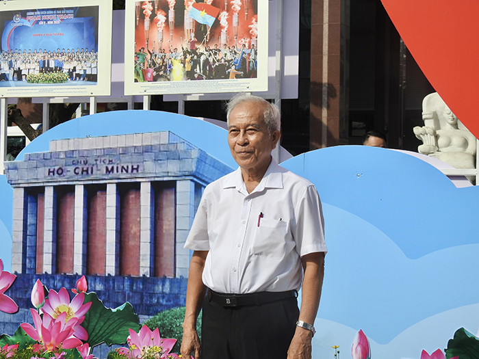 Một người dân lớn tuổi xúc động chụp ảnh lưu niệm tại tiểu cảnh trưng bày hình ảnh lăng Bác, như một cách thể hiện lòng thành kính với vị lãnh tụ kính yêu