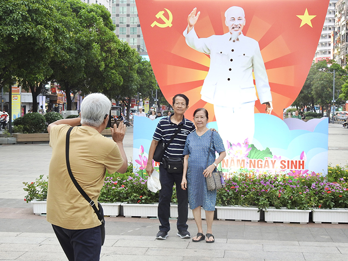 Một cặp đôi lớn tuổi chụp ảnh kỷ niệm trước mô hình Bác Hồ vẫy chào, ghi lại khoảnh khắc đầy xúc cảm trong dịp kỷ niệm ngày sinh Người