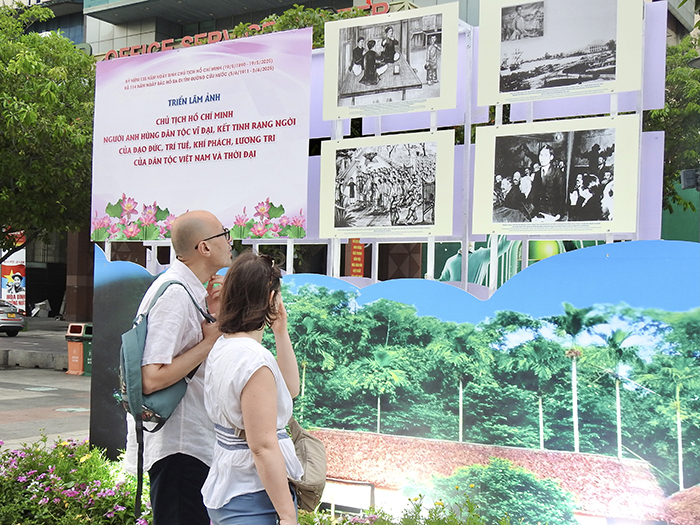 Hai du khách nước ngoài chăm chú tìm hiểu các tư liệu về Chủ tịch Hồ Chí Minh, thể hiện sự quan tâm của bạn bè quốc tế đối với lịch sử và con người Việt Nam