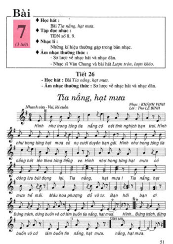 Những học sinh đang học lớp 6 chắc chắn đã và sẽ được học qua bài hát “Tia nắng hạt mưa” (thơ Lệ Bình, nhạc Khánh Vinh) trong sách giáo khoa Âm nhạc và mỹ thuật lớp 6 (Chân trời sáng tạo). Bài hát ngắn gọn, từng câu, từng chữ trong tác phẩm đều được nhà thơ Lệ Bình chăm chút kỹ lưỡng gửi gắm đến tuổi học trò: “Hình như trong từng tia nắng/ Có nét tinh nghịch bạn trai/ Hình như trong từng tia nắng/ Biết chiều tiếng ve ngân dài/ Hình như trong từng hạt mưa/ Có nụ cười duyên bạn gái/ Hình như trong từng hạt mưa/ Có dòng lưu bút đọng lại/ Tia nắng hạt mưa trẻ mãi/ Màu hoa phượng đỏ vô tư/ Bạn ơi, đừng trách vô cớ/ Làm buồn tia nắng hạt mưa!”.