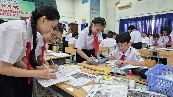 Nhà trường định hướng, mỗi tiết học tiếng Anh đều phải mang đến cho học sinh ít nhất một cơ hội để phát triển và luyện tập kỹ năng nghe, nói, để các em có thể sử dụng ngôn ngữ như một công cụ giao tiếp thật sự. Không chỉ học từ vựng hay ngữ pháp, mà các em sẽ được tham gia vào các hoạt động nhóm, đóng vai, thảo luận, thuyết trình – những hình thức giúp các em mạnh dạn, tự tin và sáng tạo hơn trong việc sử dụng tiếng Anh.