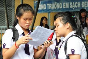Thí sinh tại HĐT Trường THPT Nguyễn Thị Minh Khai (TP.HCM) xem lại đề tại buổi thi chiều 3-6. Ảnh: Lộc Sâm